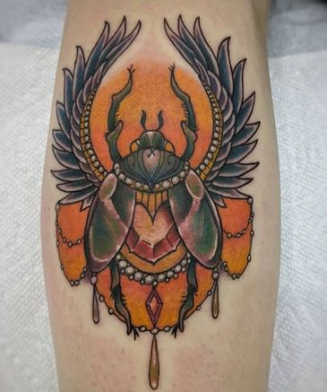 Colorful beetle tattoo by Pete in Salem NH, minutes from Methuen and Haverhill. Pete is available for walk-in tattoos and by appointment.